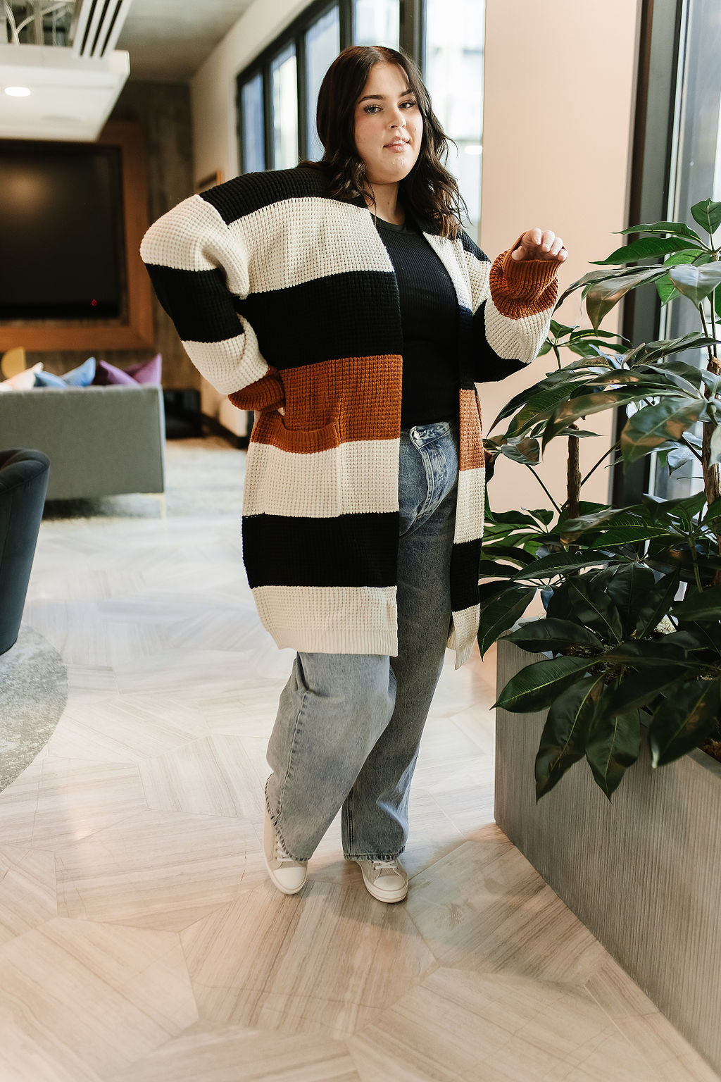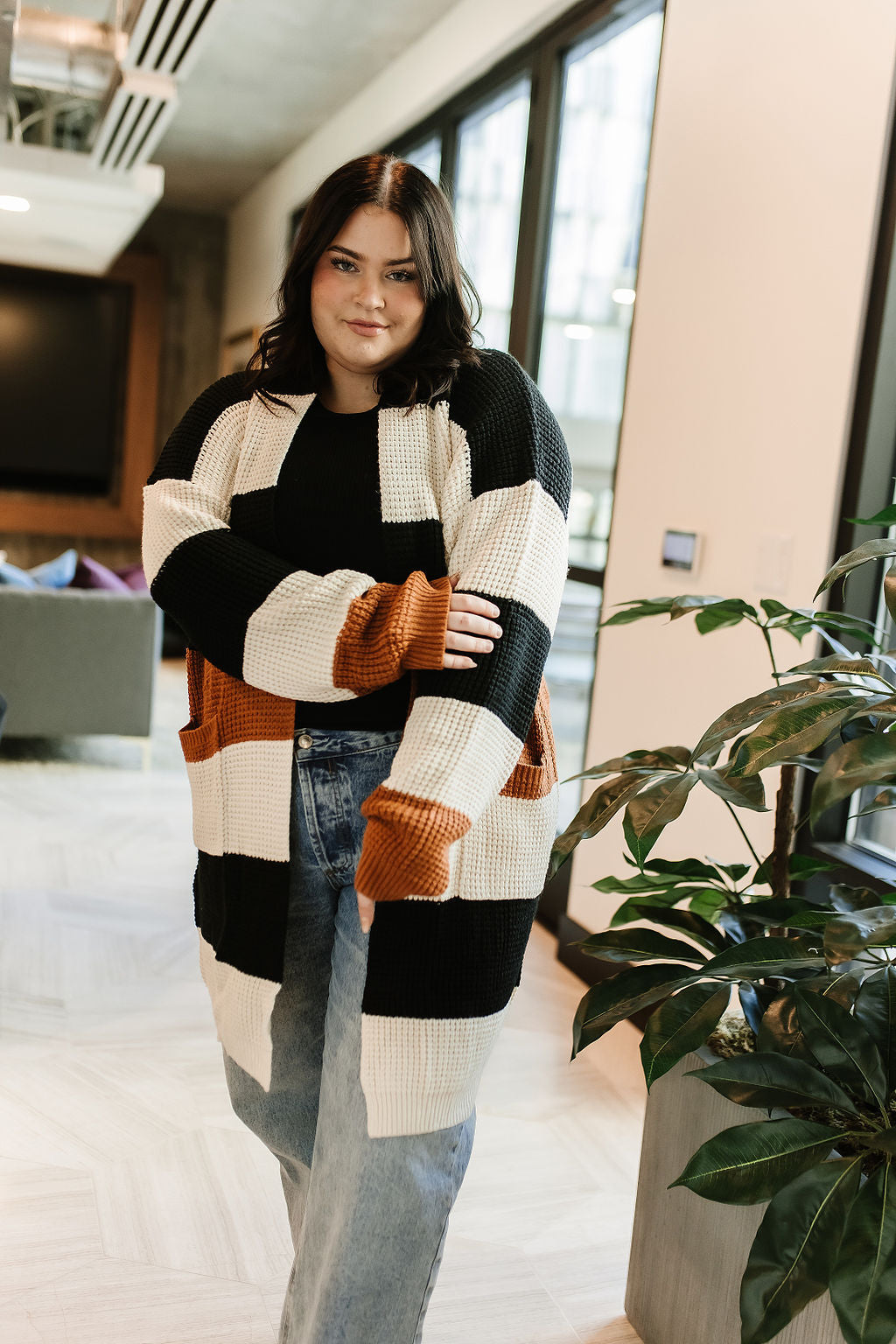 Tan, black and rust stripe open front cardigan
