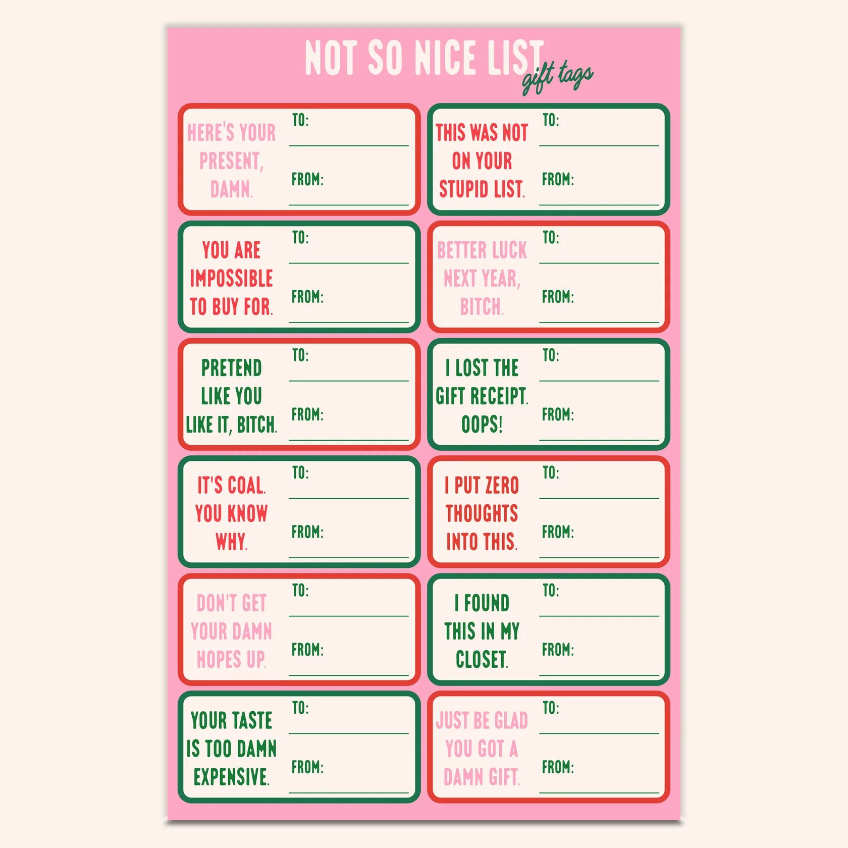 Skip the sugary sweet greetings and go straight for the sass. This Not So Nice List Gift Tag Sticker Sheet is packed with hilarious, brutally honest tags that turn every present into a moment worth unwrapping. Perfect for shoppers who love humor with a little bite.