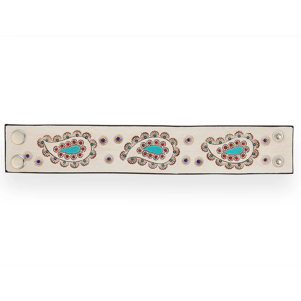 This stylish leather cuff bracelet features an intricately embossed paisley pattern. You'll love the rich, supple leather which provides a sturdy yet comfortable fit. The detailed paisley design adds a touch of intricate artistry. It's an ideal choice for those who appreciate distinctive, artisanal jewelry!